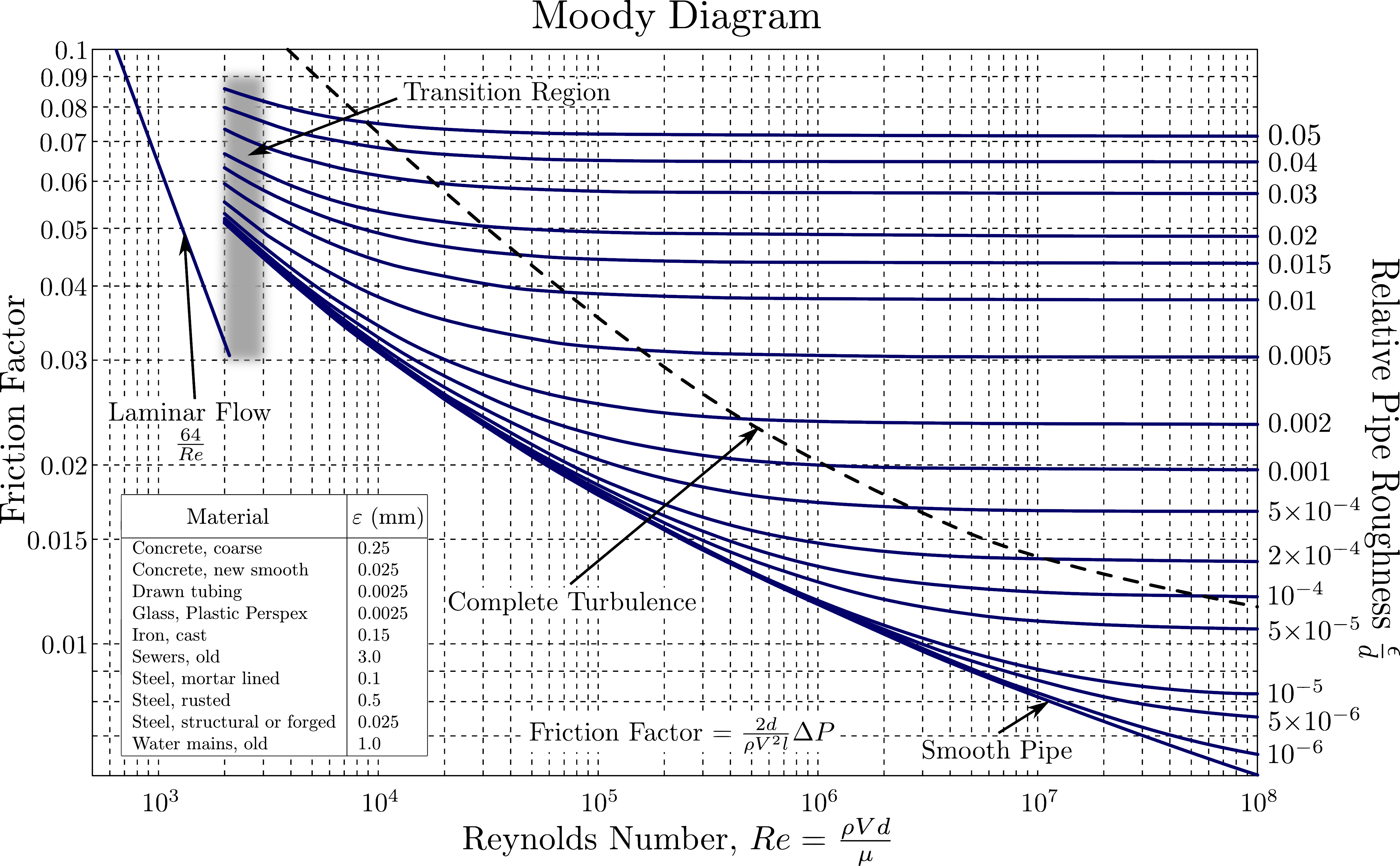 where \(D\) is the diameter of the pipe, \(u\) is the velocity of the fluid, \(\rho\) is the density of the fluid, \(\mu\) is the dynamic viscosity of the fluid, and \(\nu = \mu ⁄ \rho\) , is the kinematic viscosity of the fluid. For \(Re\) < 2100, the flow in the pipe is laminar and \(f = 64⁄Re\). For \(Re > 2300\) , the flow is turbulent, and \(f\) has to be evaluated from a chart called a Moody Chart or Moody Diagram.