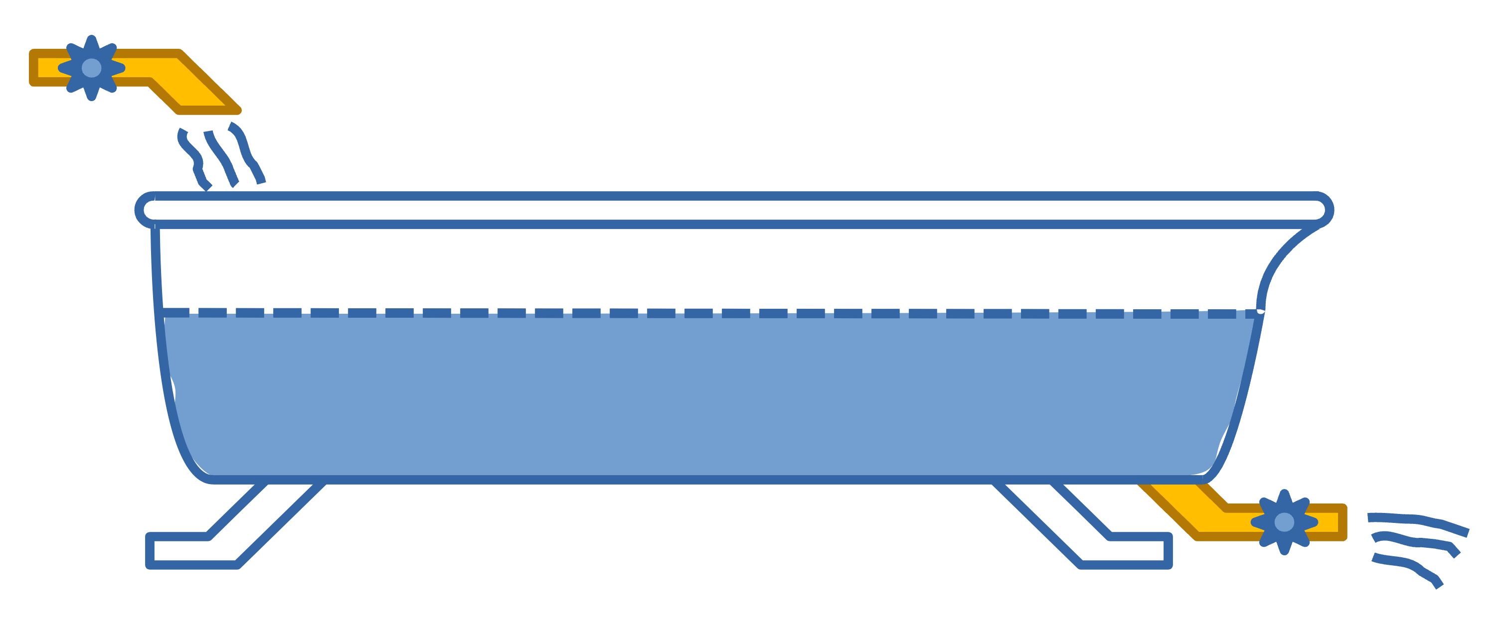 The solution given below is for the steady state, where the flow in equals the flow out. Solving the transient problem for the time to reach steady state involves using a transient mass (or volume) balance with an accumulation term. It requires the cross-sectional area of the bathtub, and results in a nonlinear ordinary differential equation that must be solved.