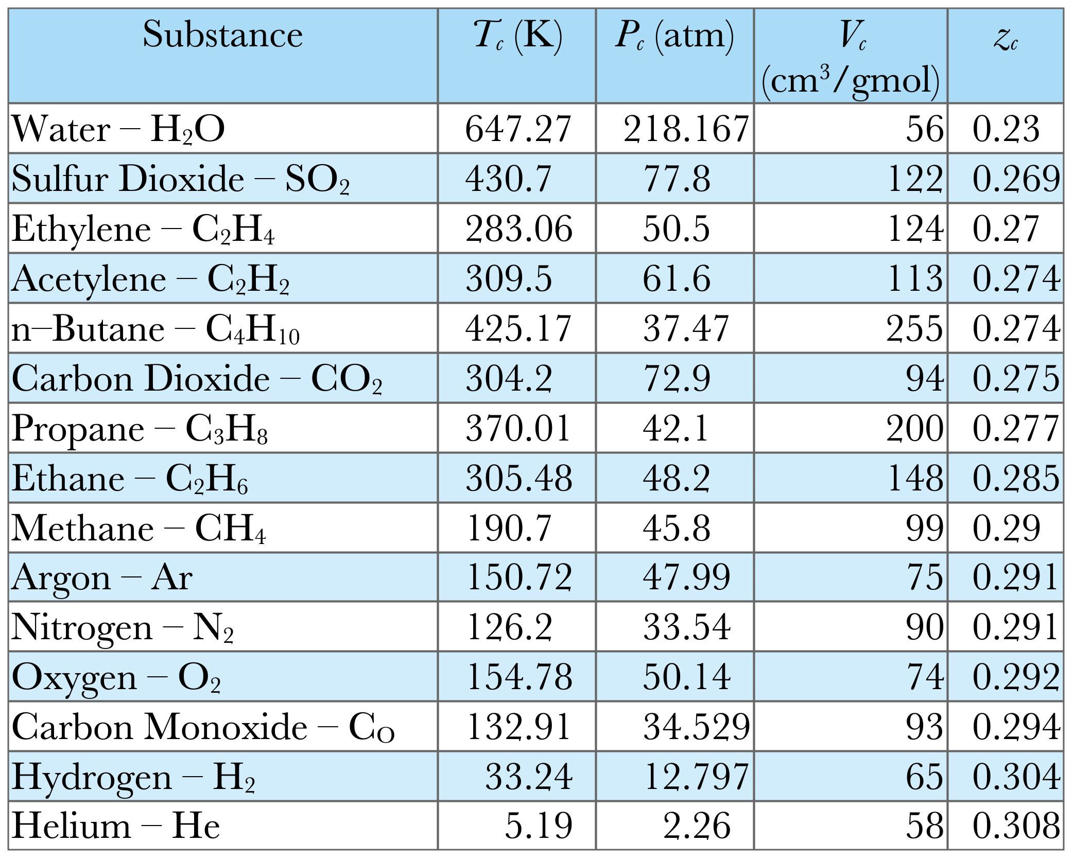 Many of them use three parameters to fit the data, the critical pressure, \(P_\mathrm{c\ }\), the critical temperature, \(T_\mathrm{c\ }\), and the acentric factor, \(\omega\).