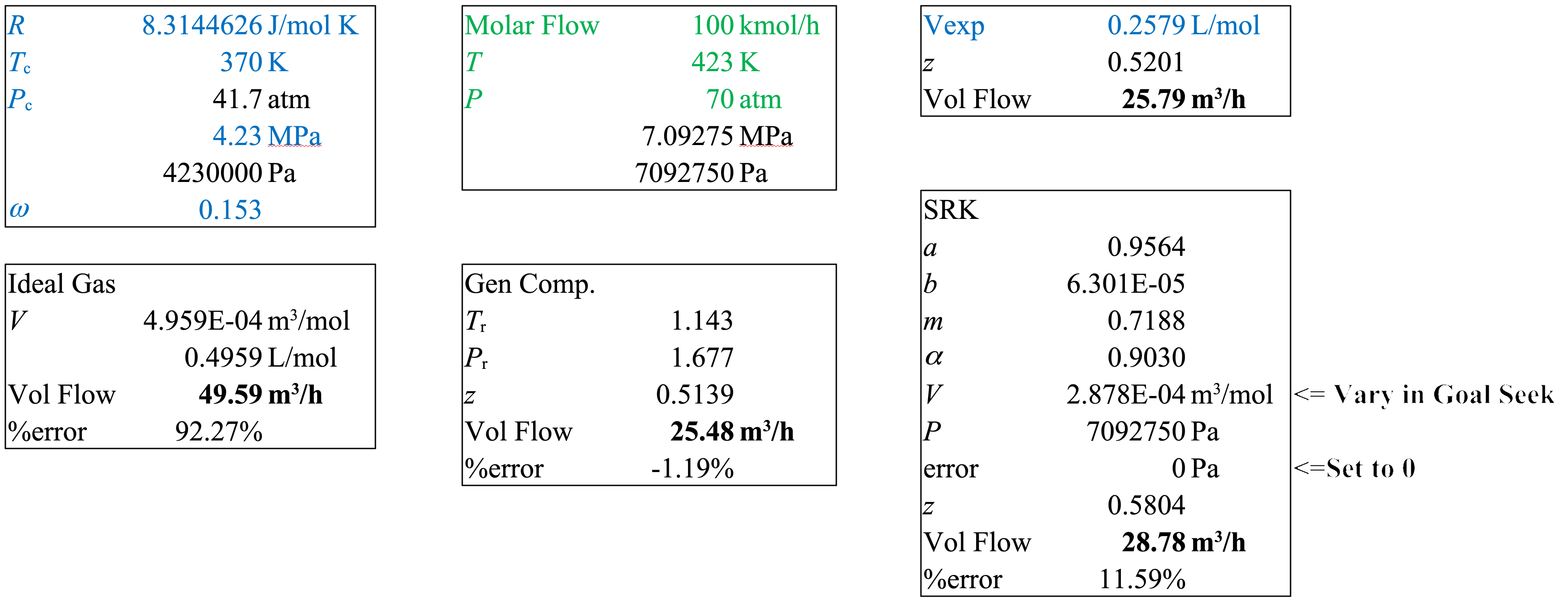 A stream of propane at \(T = 423\ \mathrm{K}\) and \(P = 70\ \mathrm{atm}\), is flowing at a rate of \(100.0\ \mathrm{kmol/h}\). Estimate the volumetric flow rate with ideal gas, generalized compressibility charts, and SRK. The measured molar volume of propane at \(423\ \mathrm{K}\) and \(70\ \mathrm{atm}\) is \(0.2579\ \mathrm{L/mol}\).