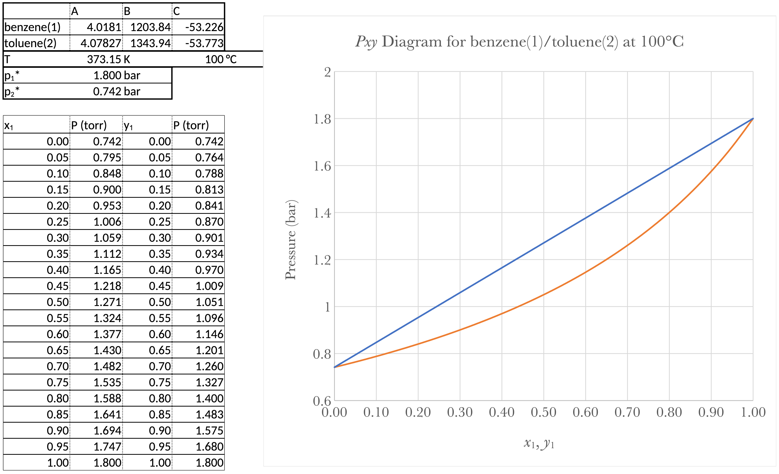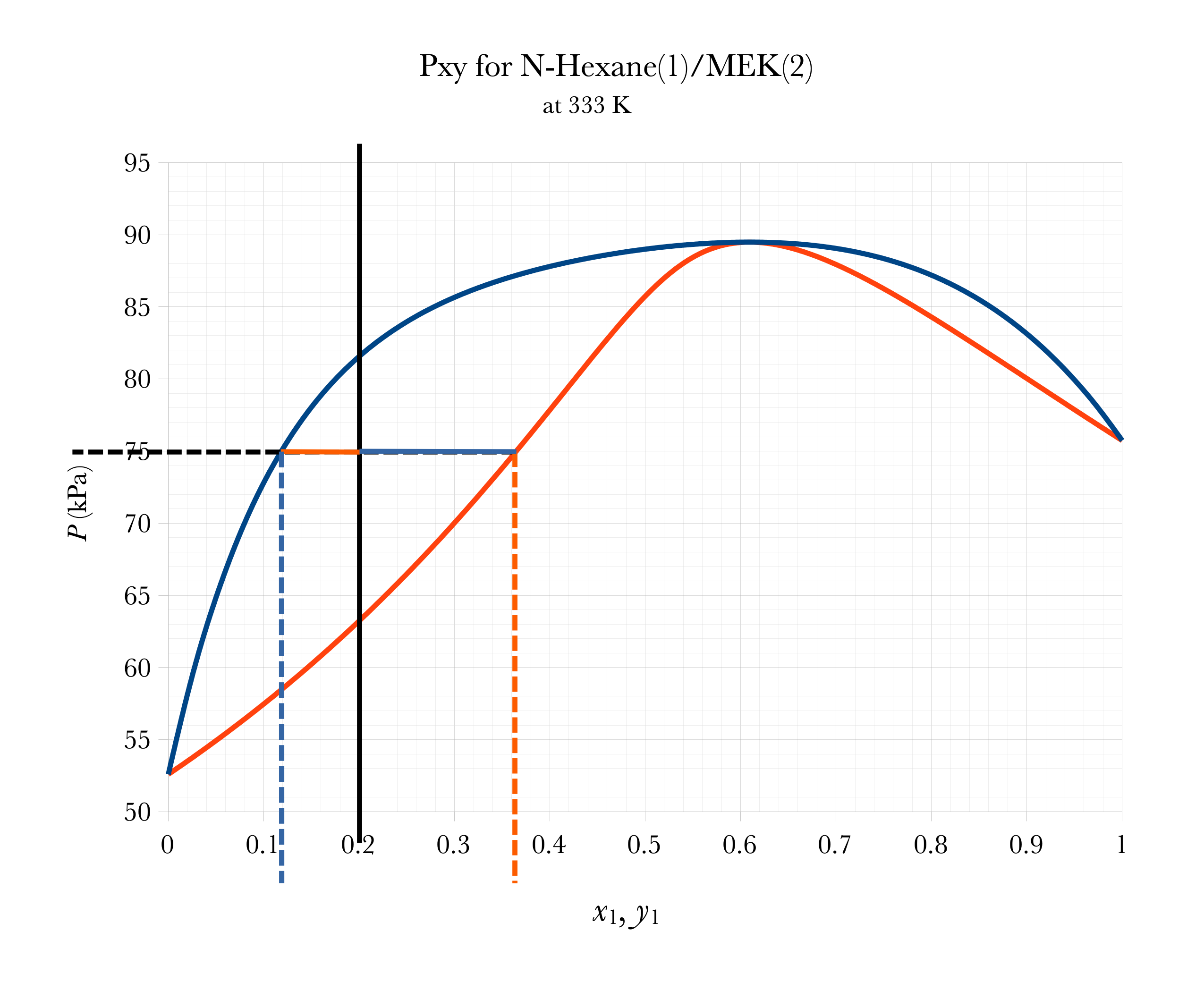 Pick a series of temperatures between \(T_\text{1-bp}\) and \(T_\text{2-bp}\) and calculate \(p_{1}^{*}\) and \(p_{2}^{*}\) and then \(y_1\).