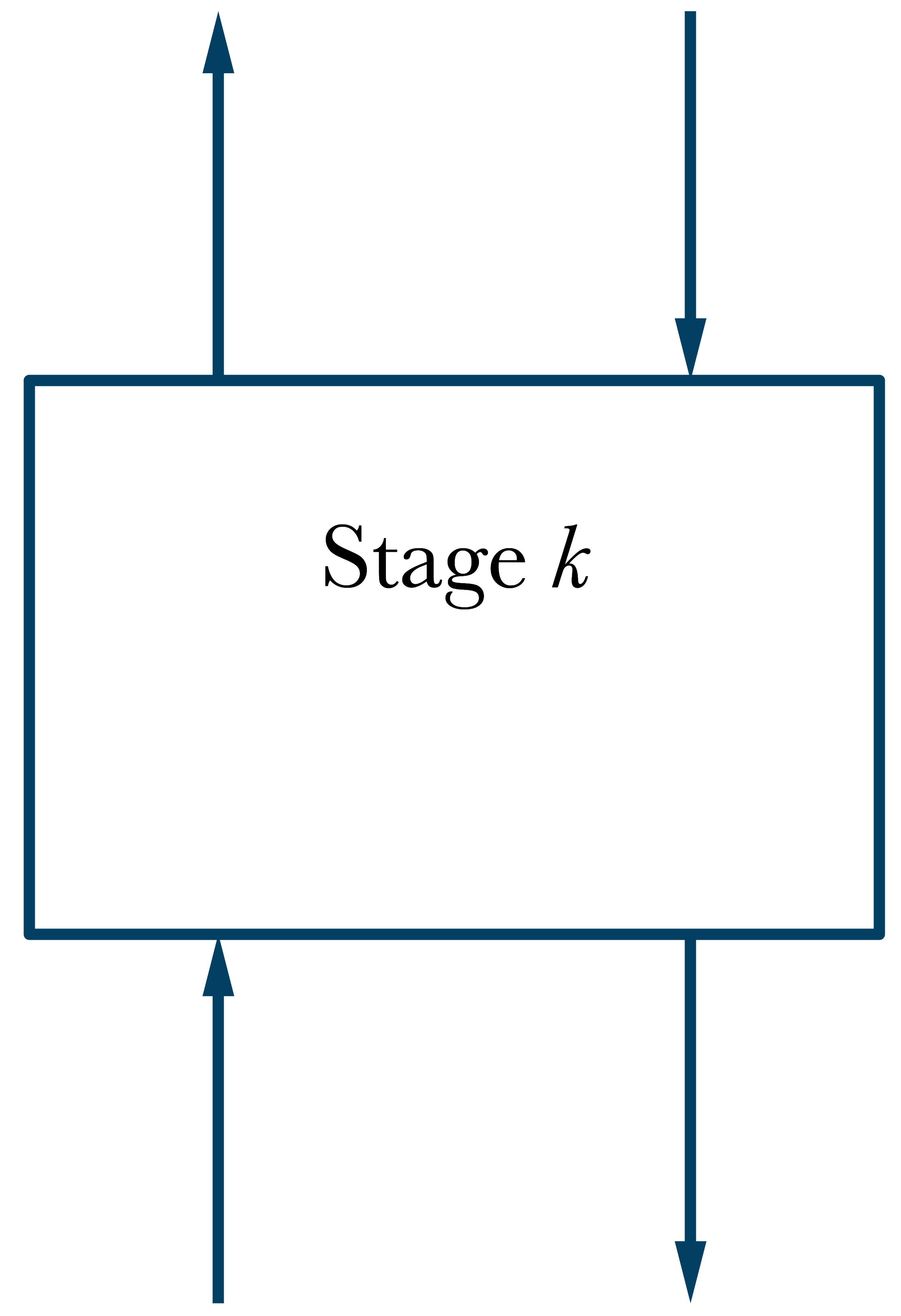 \(\dot{n}_{k+1}^l + \dot{n}_{k-1}^v = \dot{n}_{k}^l + \dot{n}_{k}^v = \dot{n}_\mathrm{tot}\)