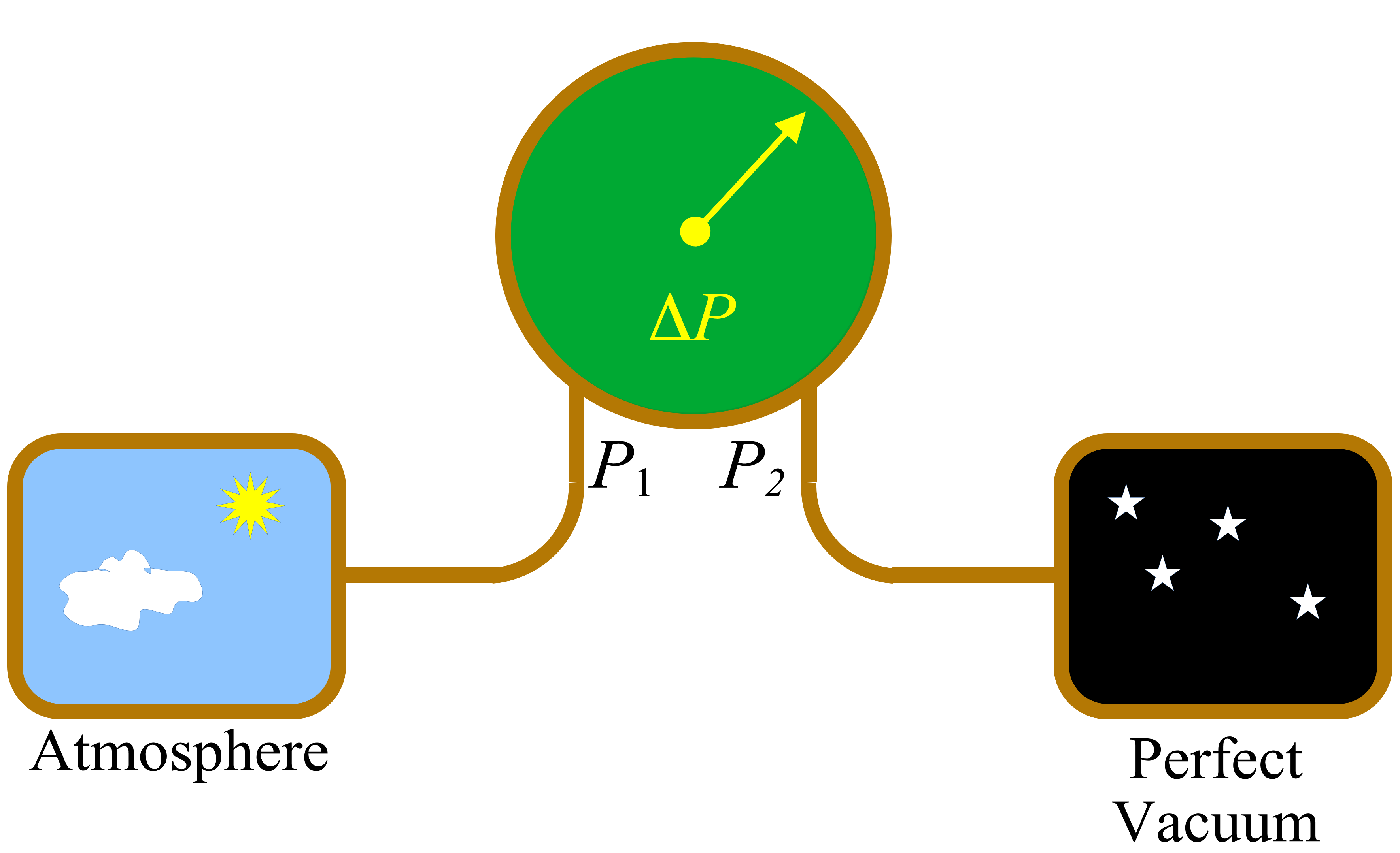 \(\Delta P = P_1 - P_2 = P_\mathrm{atmosphere}=P_\mathrm{atm}\)
