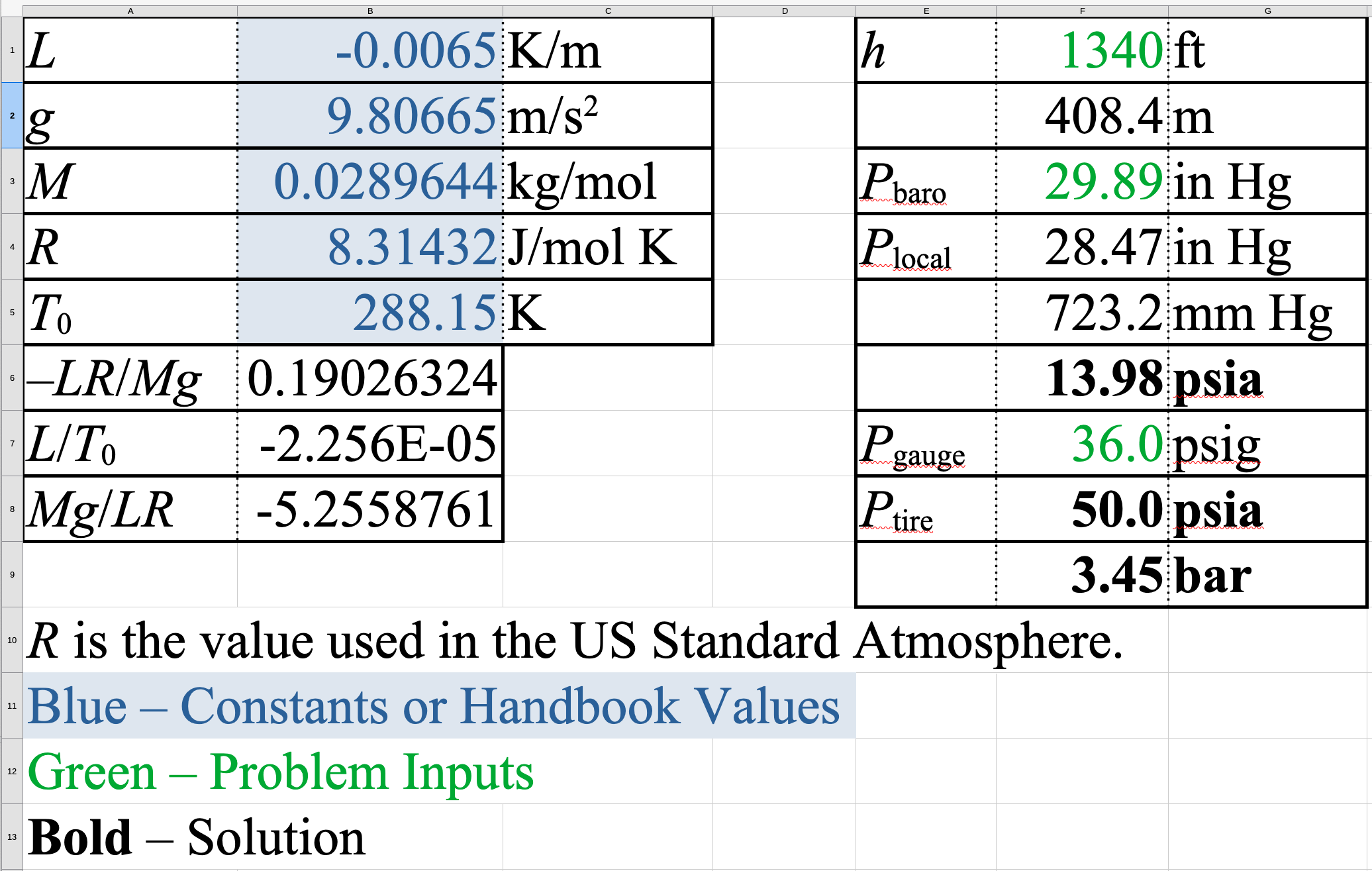 \[\begin{aligned} P_\mathrm{atm} & =P_\mathrm{baro}(1-2.25577 \times 10^{-5}h)^{-5.25588} \\ & =29.89\ \mathrm{inHg}(1-2.25577 \times 10^{-5}\cdot408.4)^{-5.25588} \\ & = 28.47\ \mathrm{inHg}= 723.2\ \mathrm{Torr}= 13.98\ \mathrm{psia} \approx 14.0\ \mathrm{psia} \end{aligned}\]